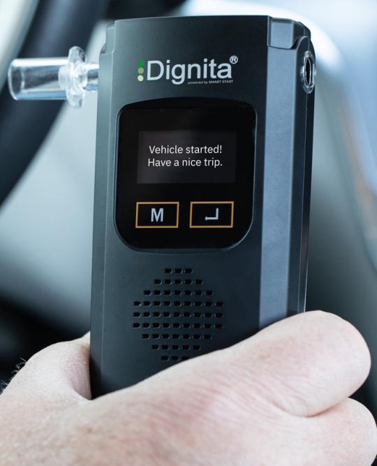 AL-100K DIGNITA è un etilometro dotato di modulo di controllo che in presenza di alcol nell'espirato del conducente inibisce la messa in moto del veicolo.